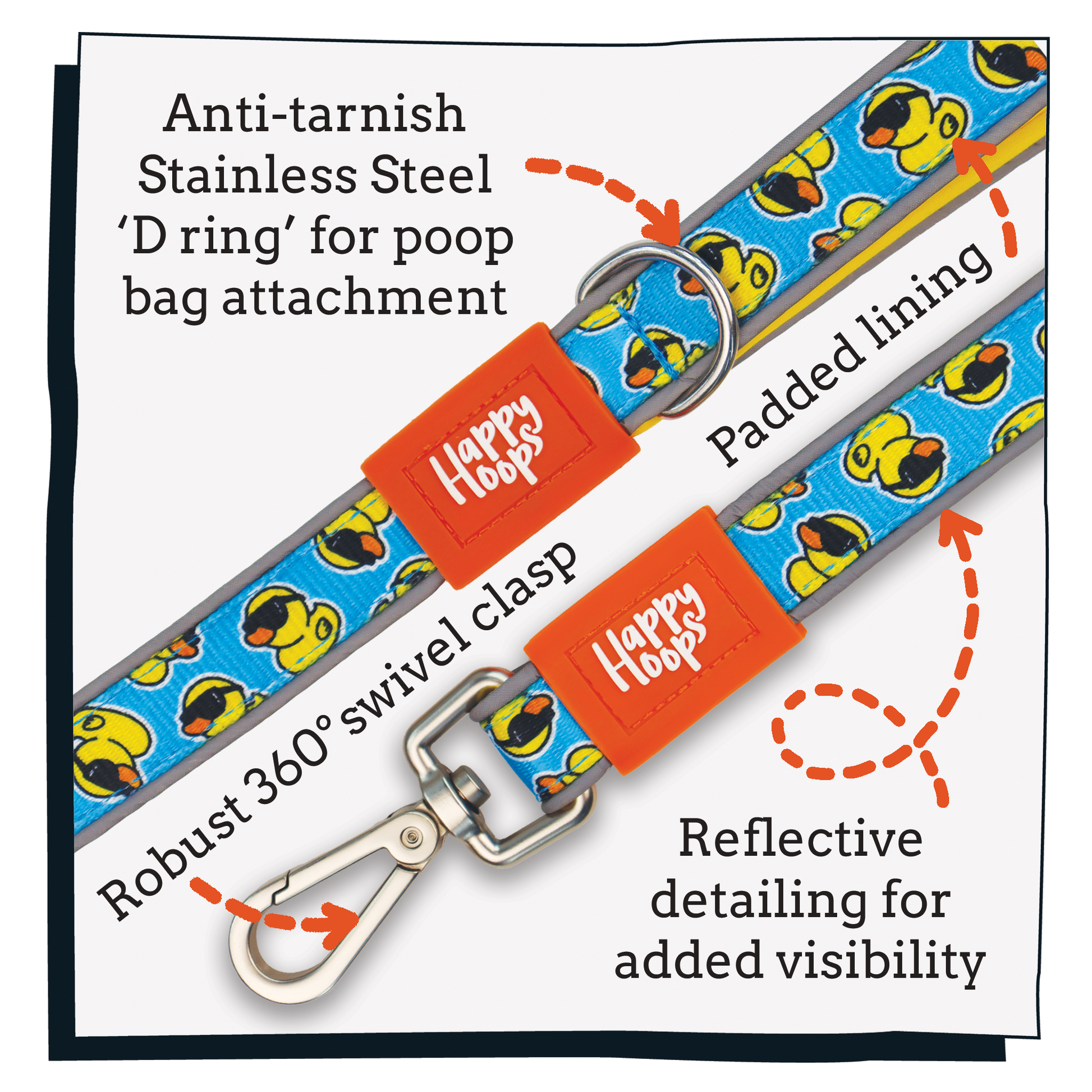 A built in rust-proof stainless steel D-ring lets you clip on a poop bag dispenser or treat pouch with ease, while the robust, 360 degree rotating metal clasp keeps the lead tangle-free on the go.