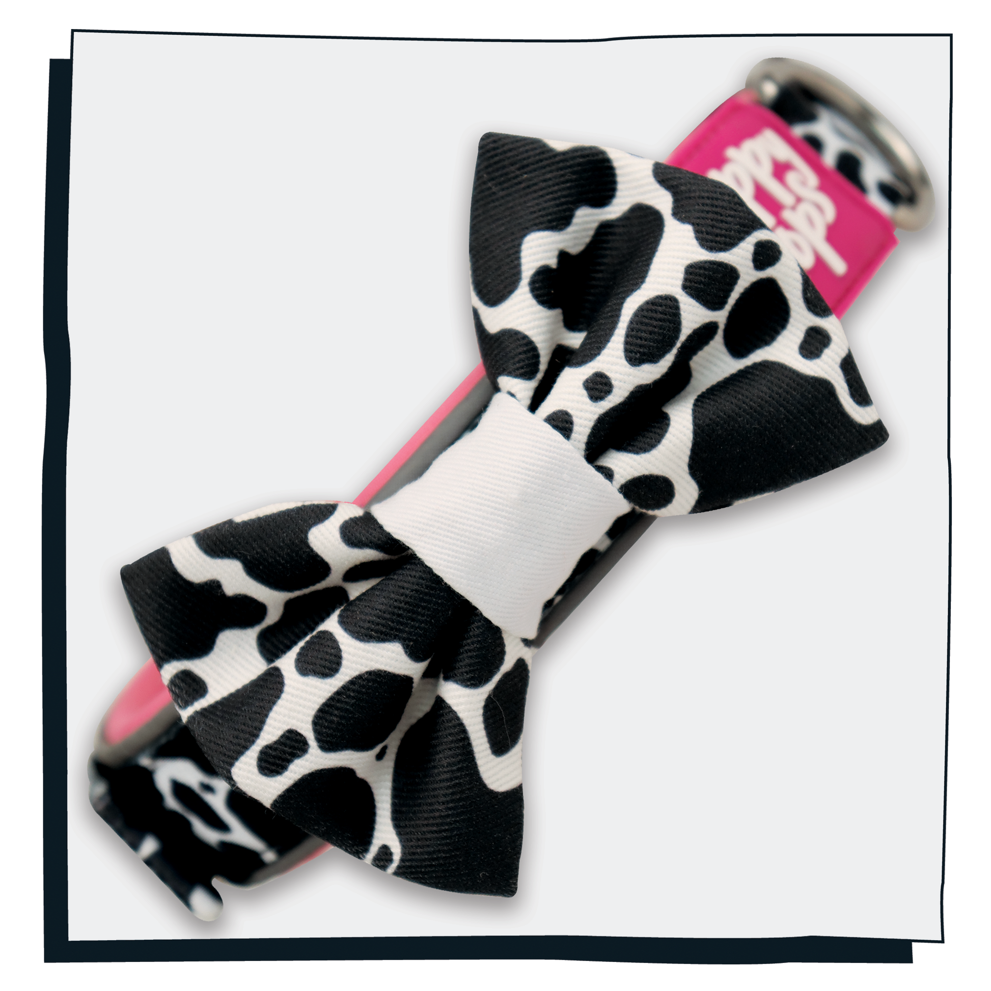 The Happy Hoops 'Udderly Perfect' bow tie features a bold and funky black and white cow print pattern, adding a playful, yet chic touch to your dogs everyday look.